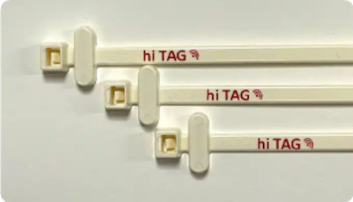 The hiTAG tag is essentially a cable tie with an integrated RFID transponder. The tag is a nylon cable, equipped with RFID technology. The tags are designed to be used for securing, serialisation, tracking and identification of products.